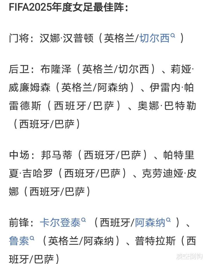 年度女足最佳阵容如下:由卡尔登泰领衔。