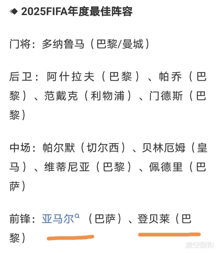 而FIFA年度最佳阵容中没有姆巴佩,这引发较大争议,可以看到亚马尔和登贝莱占据前锋位置,帕尔默、贝林厄姆、维蒂尼亚、佩德里占据中场位置,阿什拉夫、帕乔、范迪克、门德斯占据后场位置,门将是多纳鲁马。除了姆巴佩无缘最佳阵容引发争议,贝林厄姆的入选也引发争议。不少球迷表示K8金融,贝林厄姆四大皆空不配进最佳阵容。