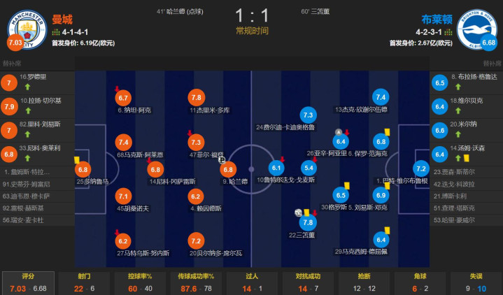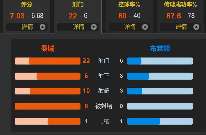 全场比赛,曼城的控球率为60%,一共有22次射门,其中6次射正;布莱顿一共有6次射门配操盘,其中3次射正。曼城丢分的问题就是哈兰德输出不稳定,还有就是球队没有第二稳定的得分点,三连平让曼城或许就此掉出争冠行列。